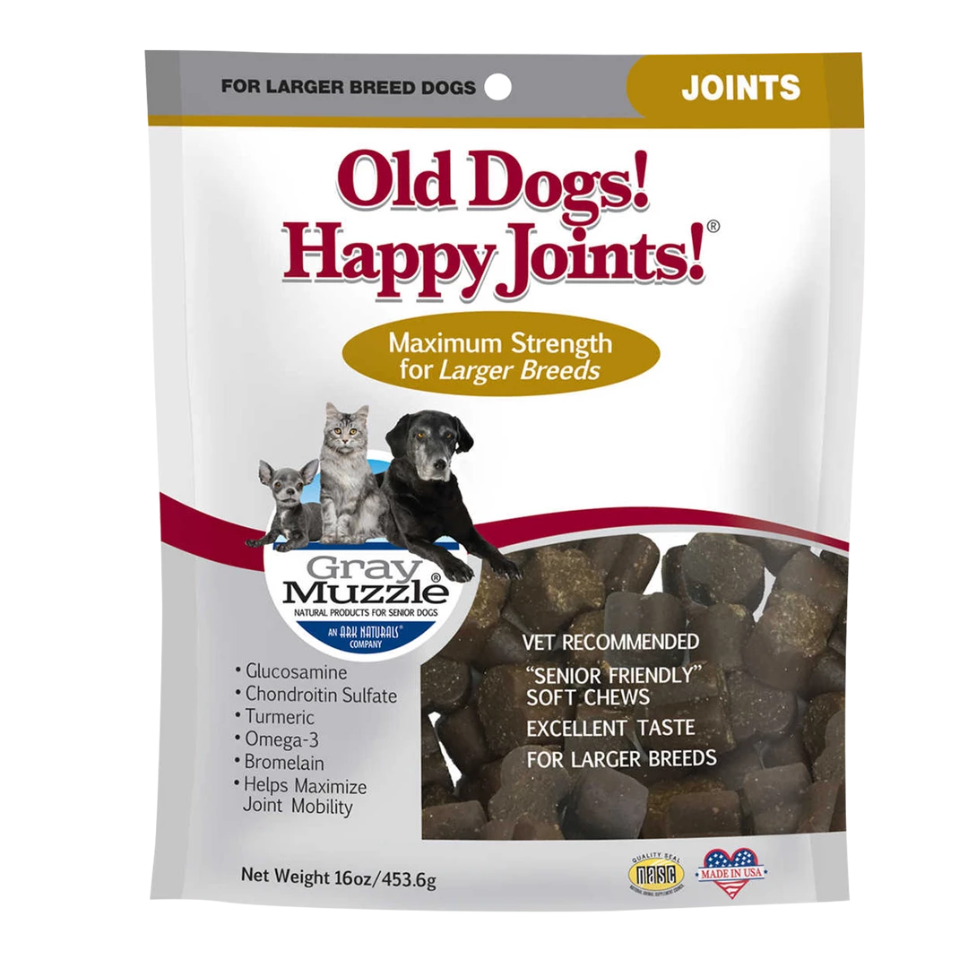 βSenior Friendlyβ bite size soft chews with excellent taste and a healthful purpose! Old Dogs! Happy Joints! is helpful for senior dog mobility, flexibility and discomfort associated with aging. Each soft chew contains glucosamine, turmeric, New Zealand green-lipped mussel, chondroitin, and egg albumin.