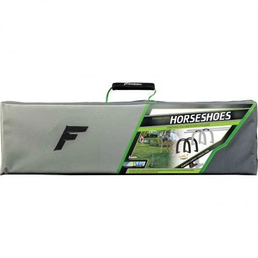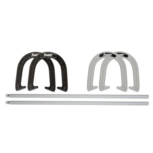 (4) Official size and weight powder coated forged steel horseshoes, (2) black and (2) silver