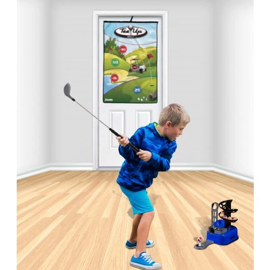 The Franklin Sports kids tee up golf game is the perfect golfing game for any youth golfer. The plastic golf balls get teed up automatically and the kid-friendly adjustable length golf club switches from driver to iron so your little golfer can practice teeing off safely and easily!