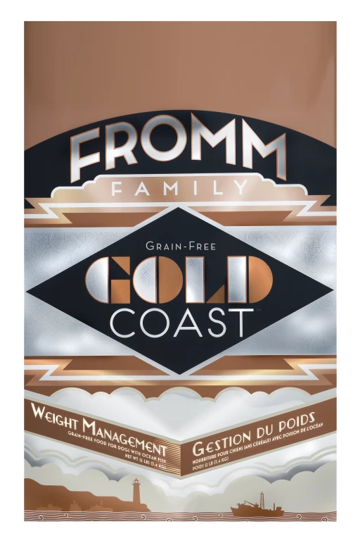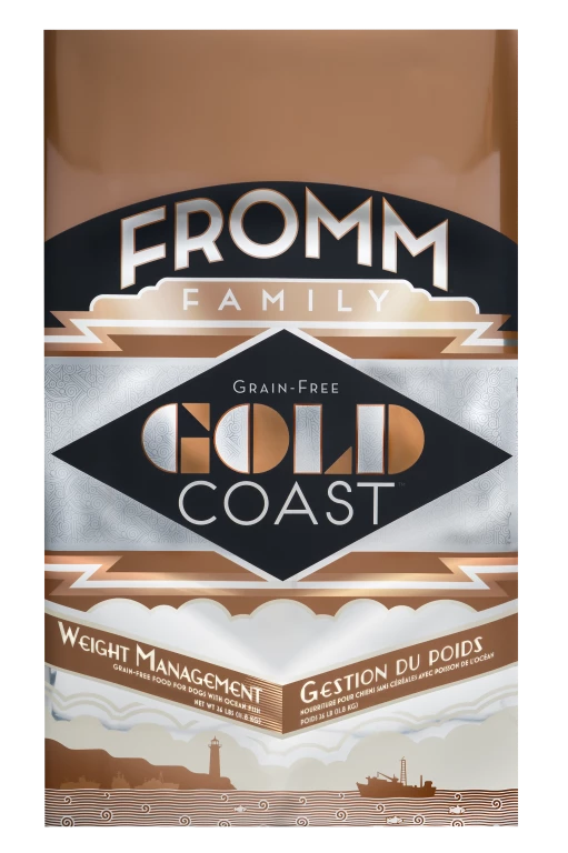 Fromm Family Gold Coast® Weight Management Food for Dogs a grain-free ocean fish recipe for weight reduction or weight maintenance. A special blend of wild caught whitefish and salmon. This food helps control calorie intake without sacrificing other valuable nutrients. For assistance in weight management, it has been supplemented with L-carnitine.