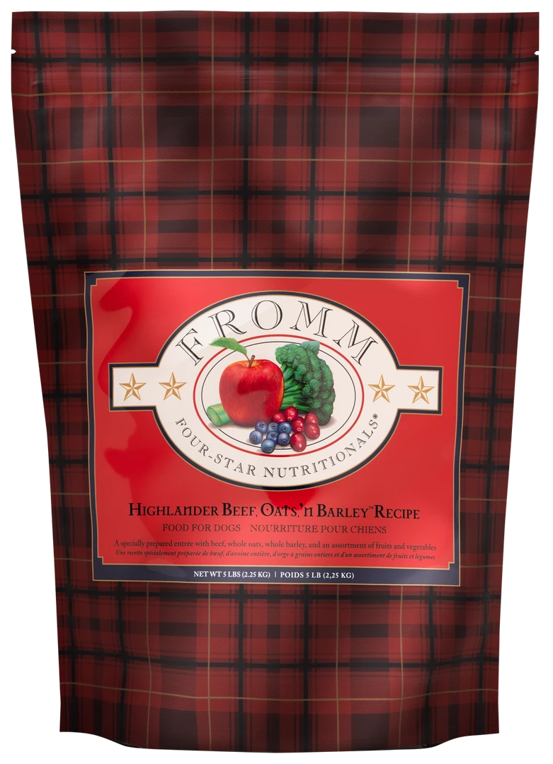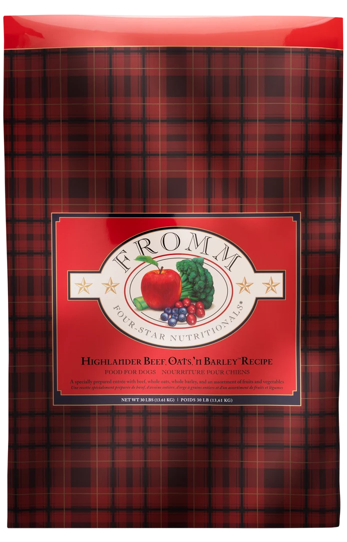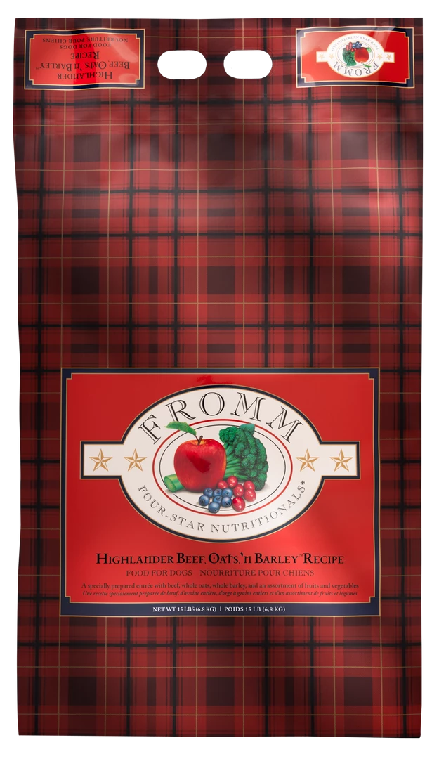 Fromm Four-Star Highlander Beef, Oats, ‘n Barley™ Recipe Food for Dogs is a delicious Scottish-inspired entrée of beef, whole oats, whole barley, and an assortment of fruits and vegetables. This distinctive blend is specially prepared to ensure consistency, quality, and superior taste in each and every bowl. Highlander Beef, Oats, ’n Barley™ Recipe provides complete and balanced nutrition for dogs of all ages and can be alternated with other Fromm Four-Star recipes.