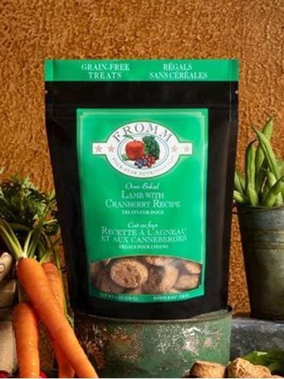 Fromm Four-Star Lamb with Cranberry treats are a savory snack, dessert, or well deserved reward. A grain-free, oven baked treat made with lamb, cranberries, apples, vegetables, and parsley.