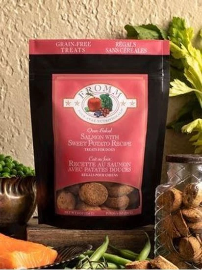 Fromm Four-Star Salmon with Sweet Potato treats are a savory snack, dessert, or well deserved reward. A grain-free, oven baked treat made with wild salmon, sweet potatoes, green bell peppers, and spinach.