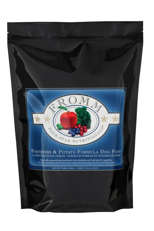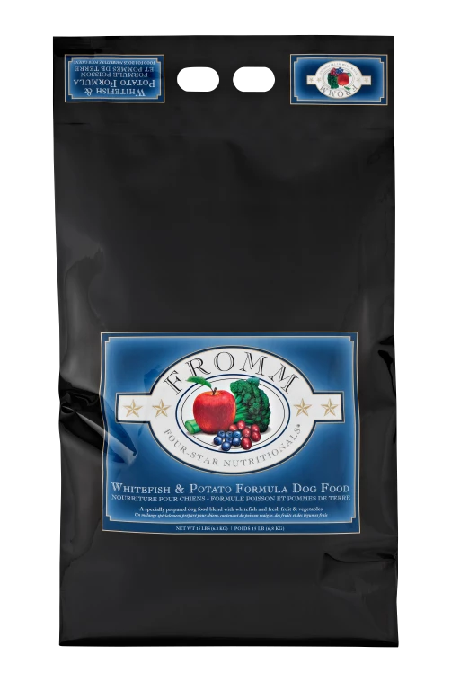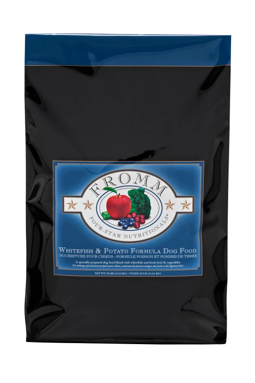 Fromm Four-Star Whitefish & Potato Formula is a flavorful entrée of whitefish, fish broth, sweet potatoes, potatoes, and an assortment of fruits and vegetables. This recipe is specially prepared to ensure consistency, quality, and superior taste in each and every bowl. Whitefish & Potato Formula provides complete and balanced nutrition for dogs of all ages and can be alternated with other Fromm Four-Star recipes.