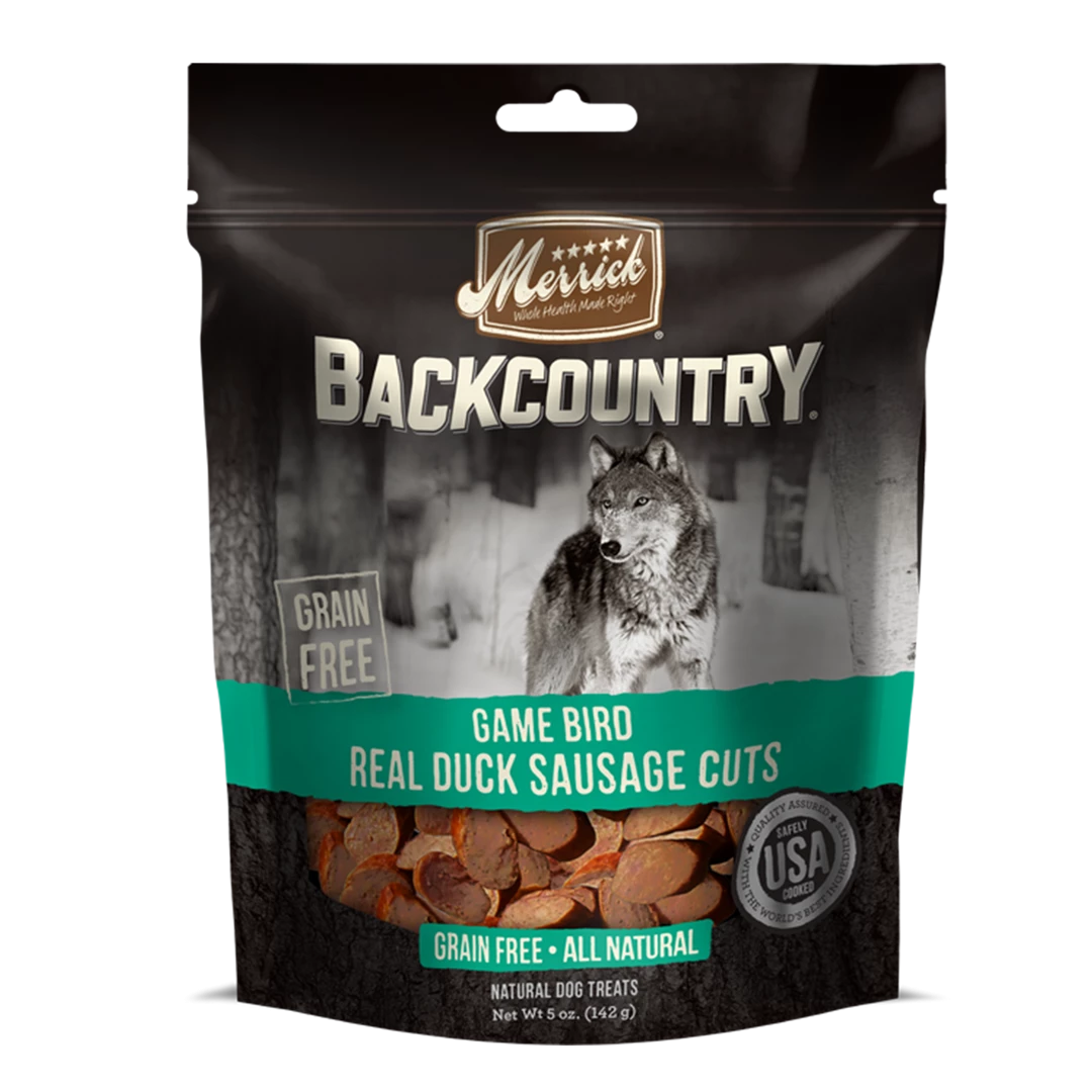 Treat your dog with Merrick Backcountry Gamebird real duck sausage cuts. We use 100% USA-sourced, pure duck that is wood-smoked to create sausage with hearty flavor. Real duck is the #1 ingredient, with no by-products or fillers for a meaty, great tasting treat your dog will love.