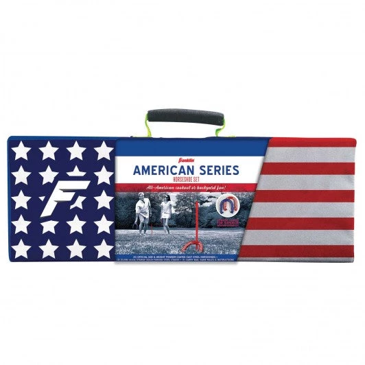 (4) Official size & weight powder-coated cast steel horseshoes, (2) blue and (2) red