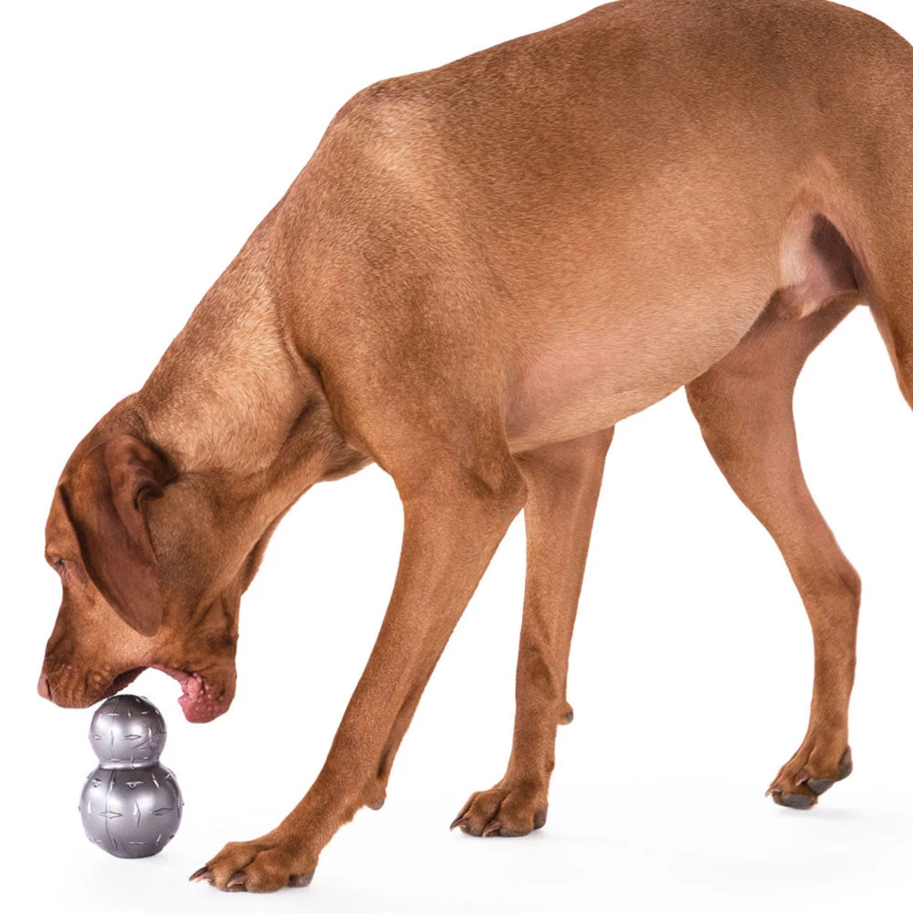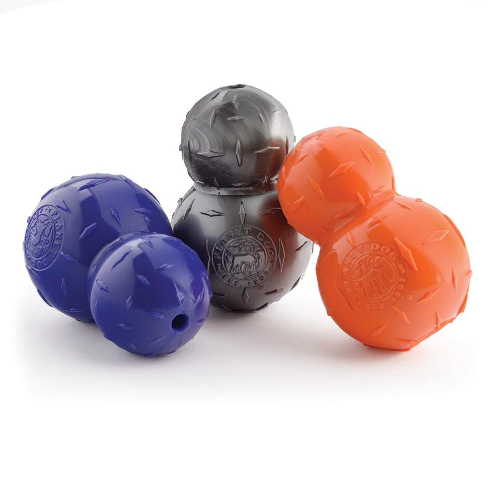 Double the tuff. Double the fun! The Double-Tuff is available in purple, orange, green, or steel. It comes in 3 sizes: Small = 3″ high, Medium = 4″ high, Large = 5″ high. It is rated at 5 out of 5 chompers on our Durability Scale, making it suitable for most dogs. 100% GUARANTEED. Any time. Every time. Made in the USA.