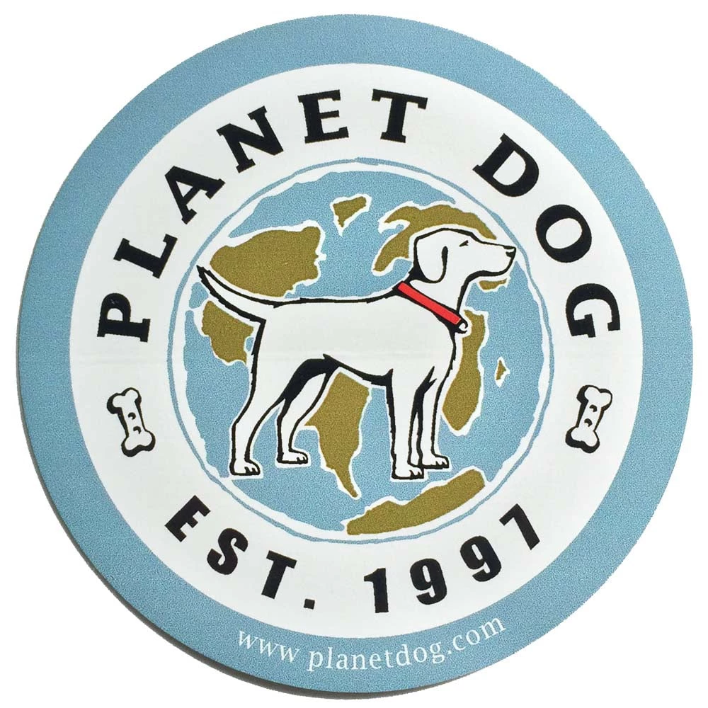The Planet Dog logo sticker measures 4”. Made in the USA. 100% GUARANTEED. Any time. Every time.