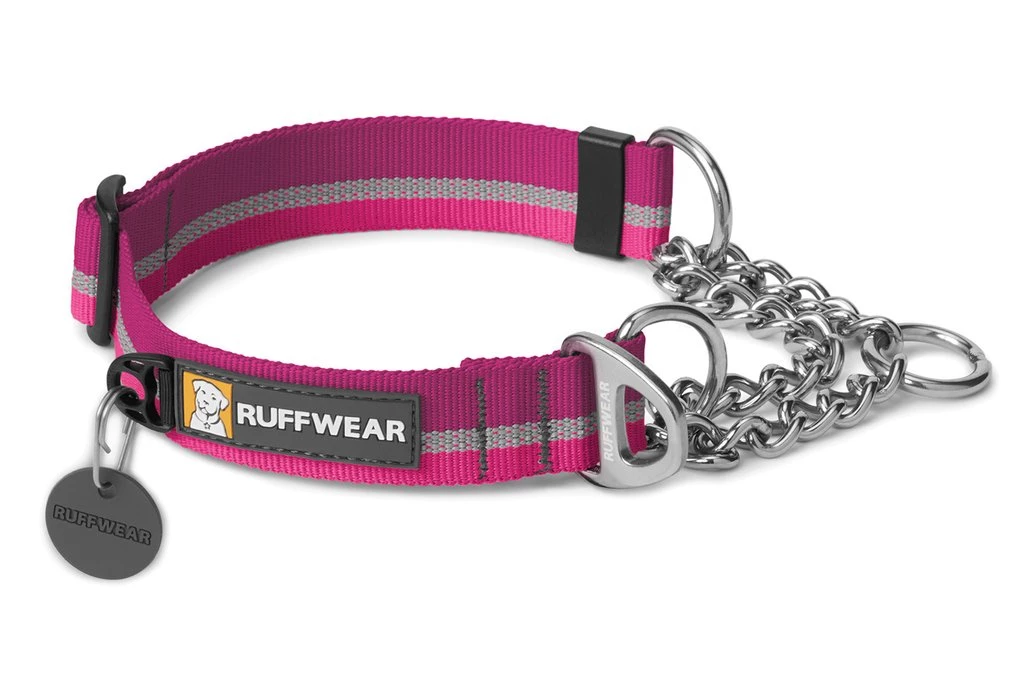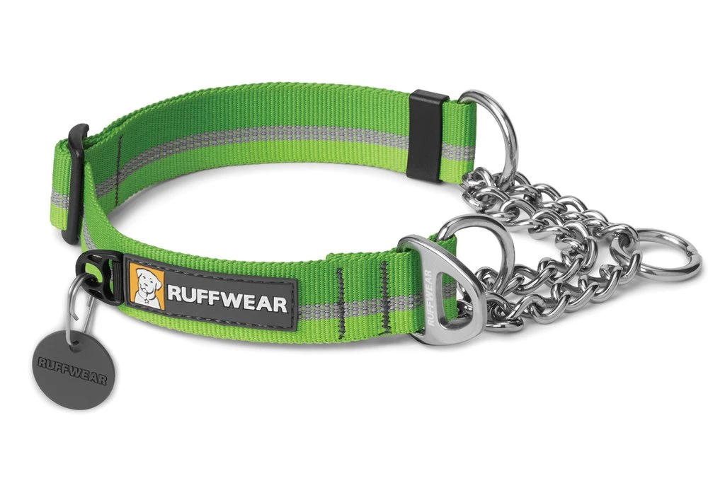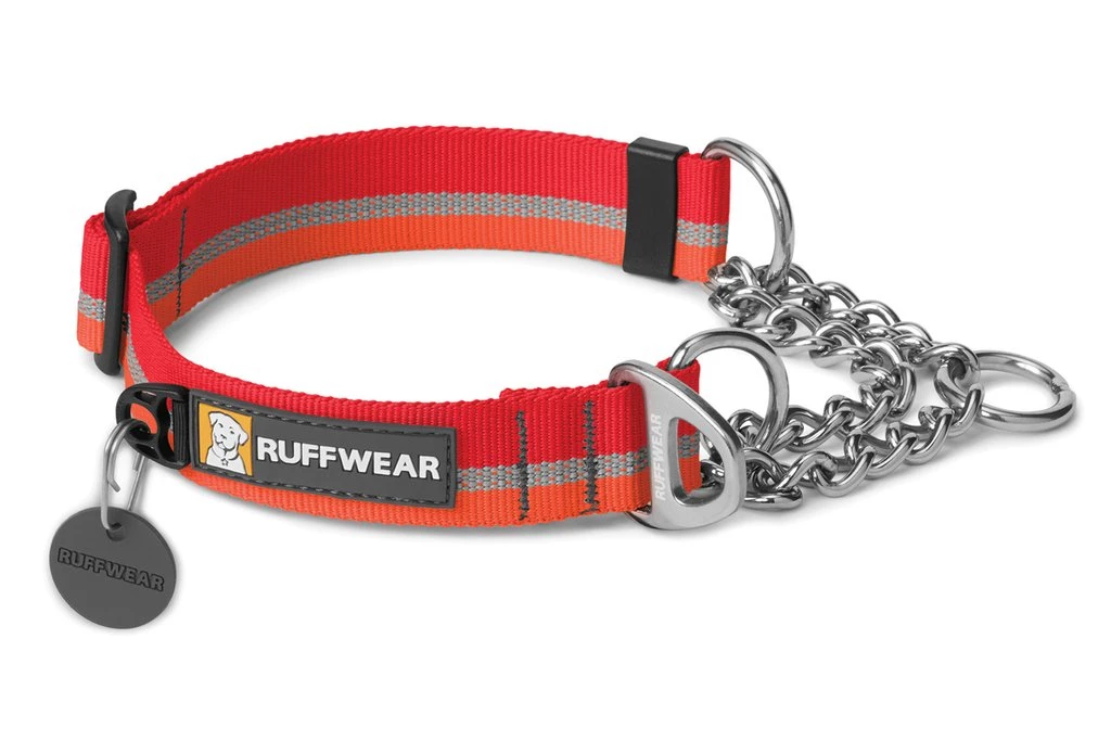 The Ruffwear Chain Reaction Collar is a martingale-style collar that combines Ruffwear-designed TubeLok™ webbing and a short section of stainless steel chain. This collar provides limited correction with an audible cue, making it a great training tool. In addition to the chain attachment point, this collar also features a V-ring attachment option for use as a standard collar.