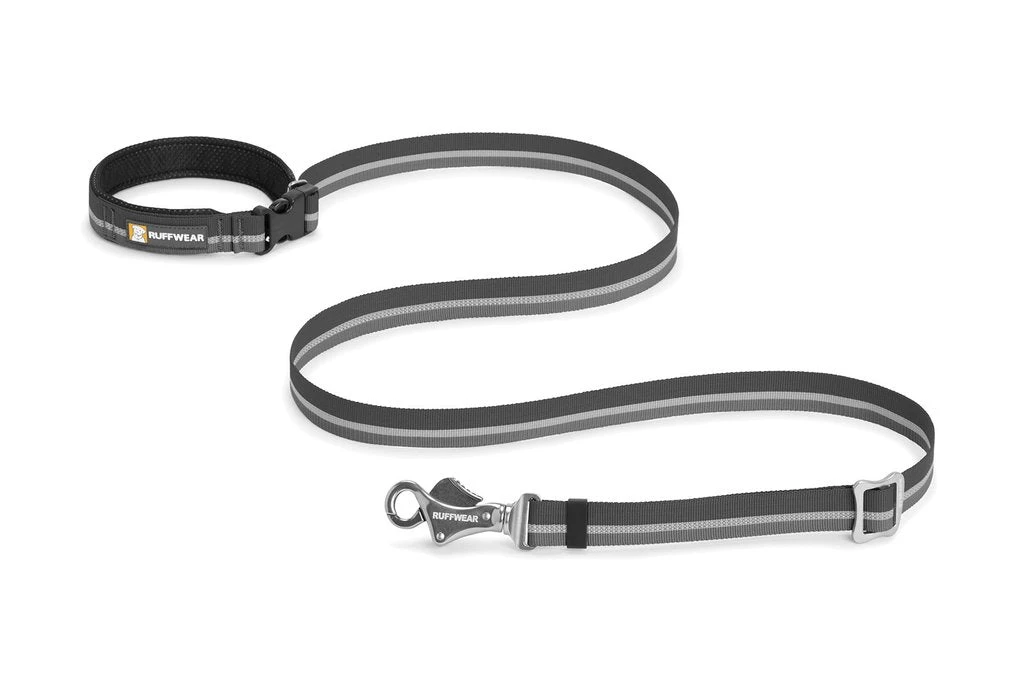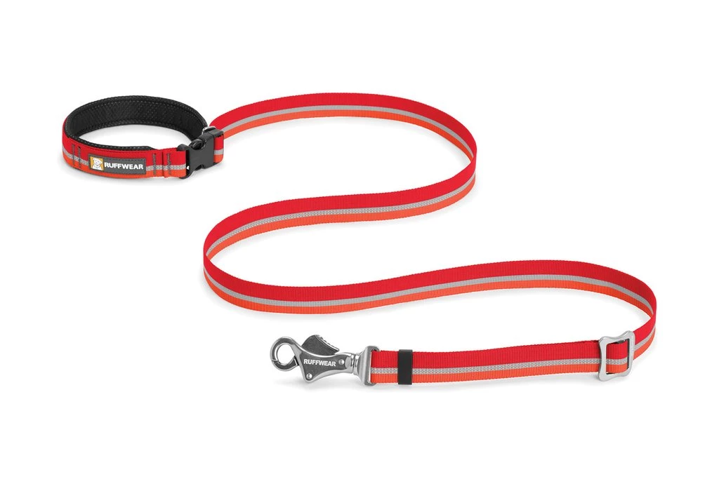 The Ruffwear Slackline Leash is an adjustable-length leash that can be hand-held or waist-worn. The 6 to 3.5-foot (1.8 to 1.1 m) adjustable length can be fully extended for relaxed walks, or shortened for more control as needed. An ergonomic metal slider allows for easy one-handed length adjustment on the go.