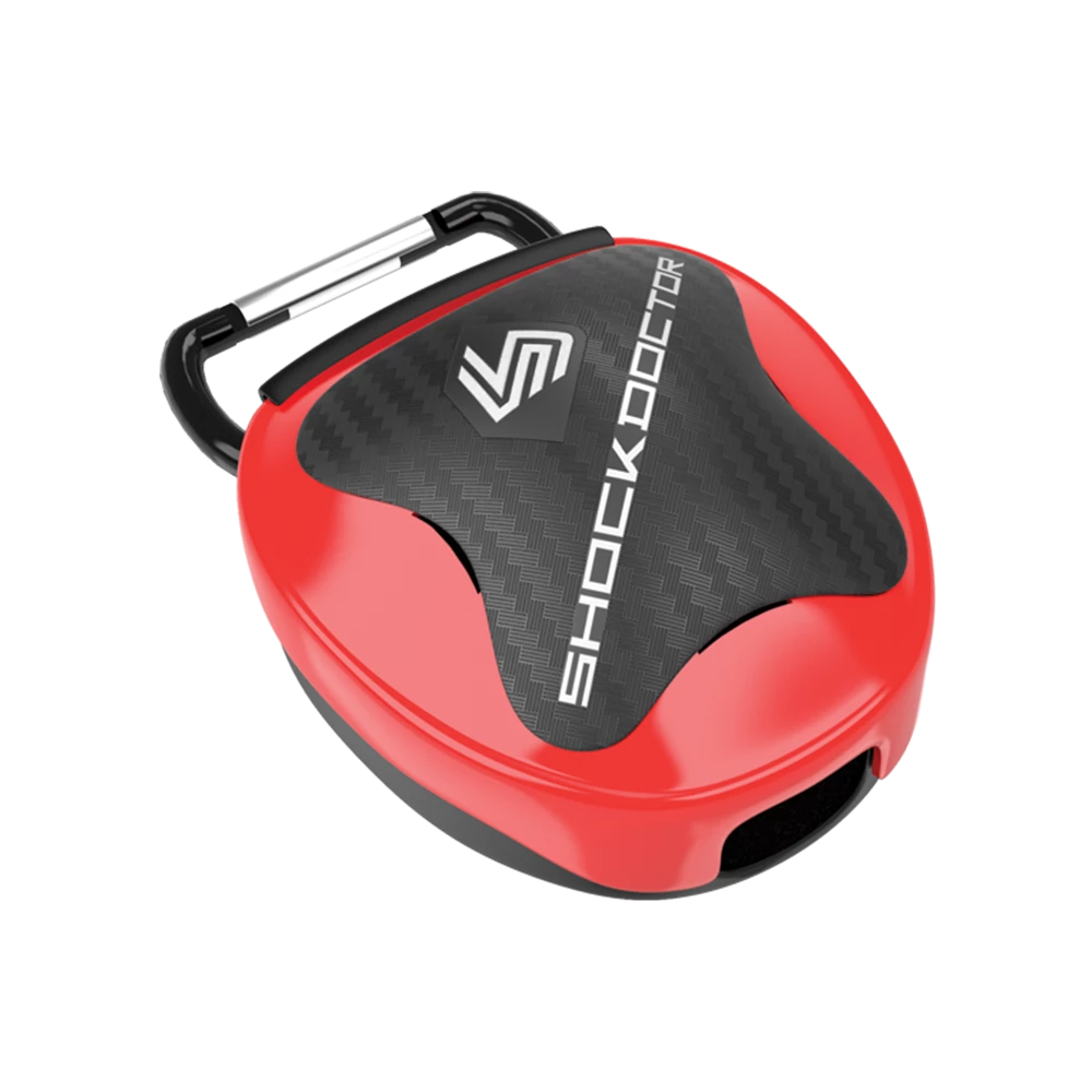 Heavy duty ventilated case with carabiner attachment system provides secure, clean storage for a single mouthguard to reduce exposure to bacteria.