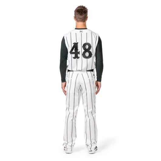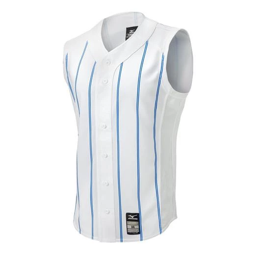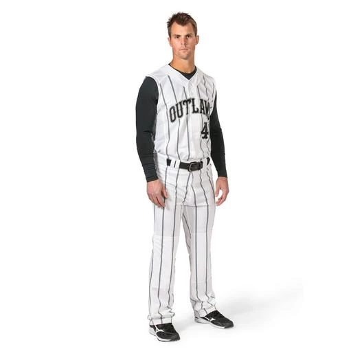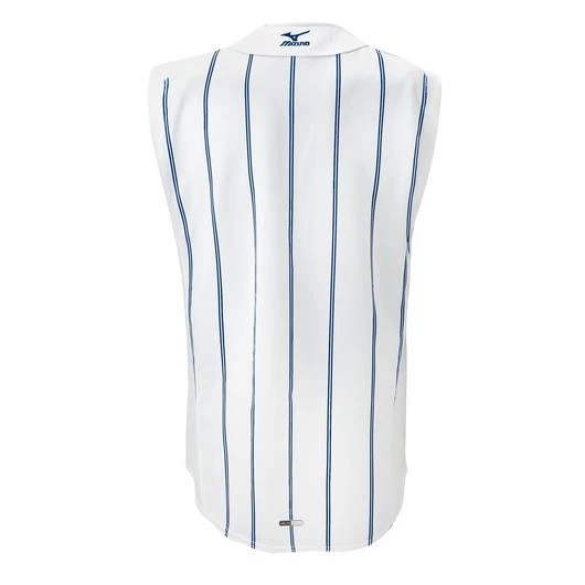Lightweight moisture wicking fabric with dual Pinstripe print. Classic Full- button Baseball Jersey design with sleeveless construction for improved range of motion.
