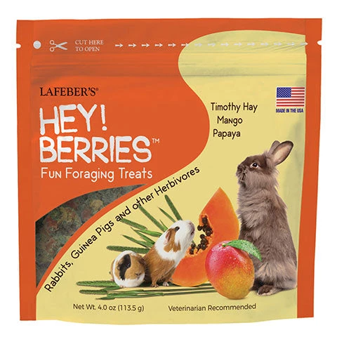 You want to spoil your precious companion a little with treats, but you want those treats to be healthy. Does this mean you can only offer some vegetables and some limited fruit? Definitely not. Widen the treat horizon of your rabbits and guinea pigs with Hey!Berries™. These non-GMO, hay-based treats are 70% timothy grass mixed with visible dices of mango and papaya. Formulated for herbivores, Hey!Berries™ are high-fiber, low-calcium, low-fat treats you can feed with confidence. That’s good nutrition in each Hey!Berrie. Also, Hey!Berries™ promote good health because the high-fiber content helps keep the digestive tract moving.