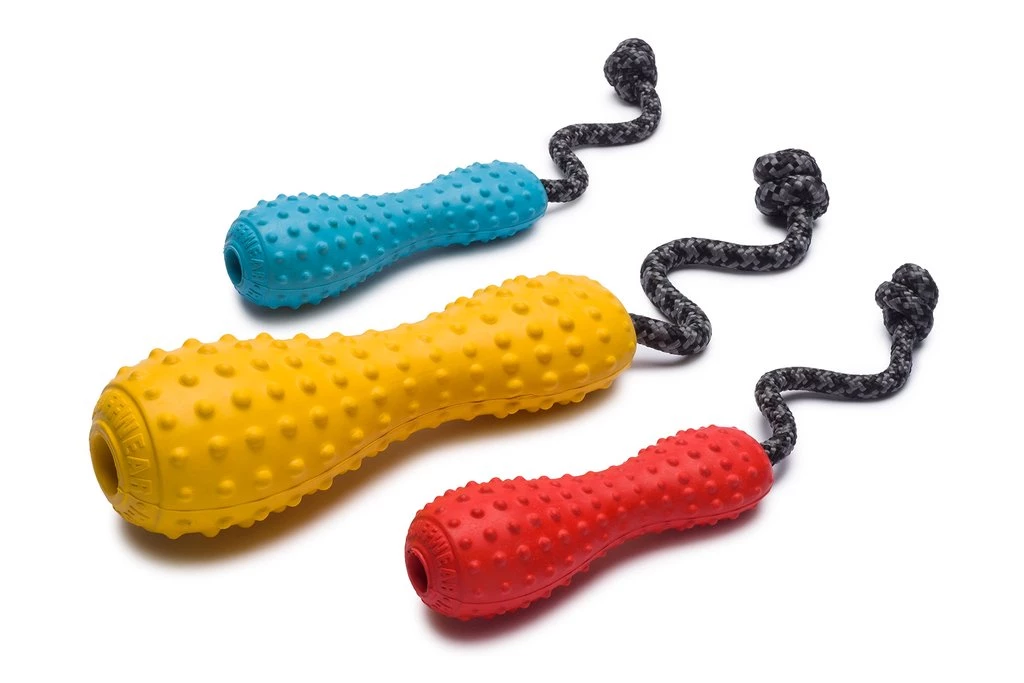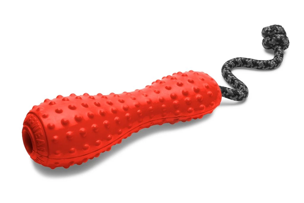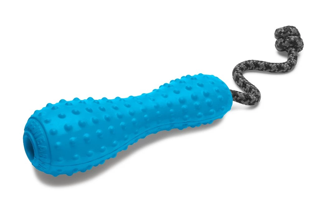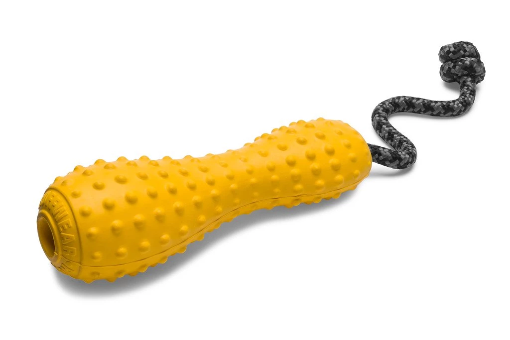 The Gourdo rubber toy is designed for interactive play, from tugging to throwing, this durable rubber toy does it all. The kernmantle rope lanyard makes it easy to throw and pick up, while avoiding the slobbery rubber end.