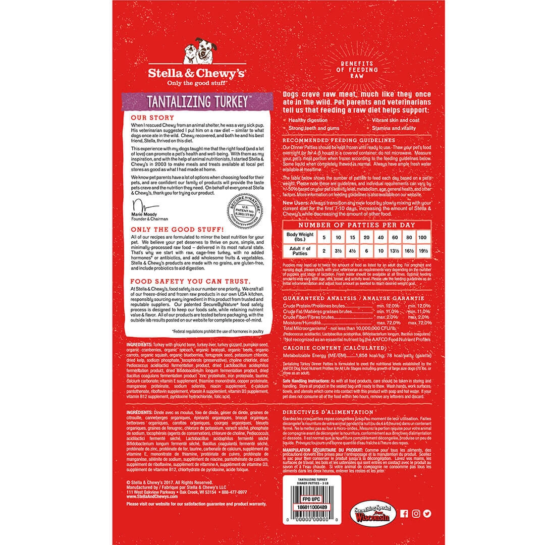 Turkey with ground bone, turkey liver, turkey gizzard, pumpkin seed, organic cranberries, organic spinach, organic broccoli, organic beets, organic carrots, organic squash, organic blueberries, fenugreek seed, potassium chloride, dried kelp, sodium phosphate, tocopherols (preservative), choline chloride, dried Pediococcus acidilactici fermentation product, dried Lactobacillus acidophilus fermentation product, dried Bifidobacterium longum fermentation product, dried Bacillus coagulans fermentation product zinc proteinate, iron proteinate, taurine, calcium carbonate, vitamin E supplement, thiamine mononitrate, copper proteinate, manganese proteinate, sodium selenite, niacin supplement, d-calcium pantothenate, riboflavin supplement, vitamin A supplement, vitamin D3 supplement, vitamin B12 supplement, pyridoxine hydrochloride, folic acid.